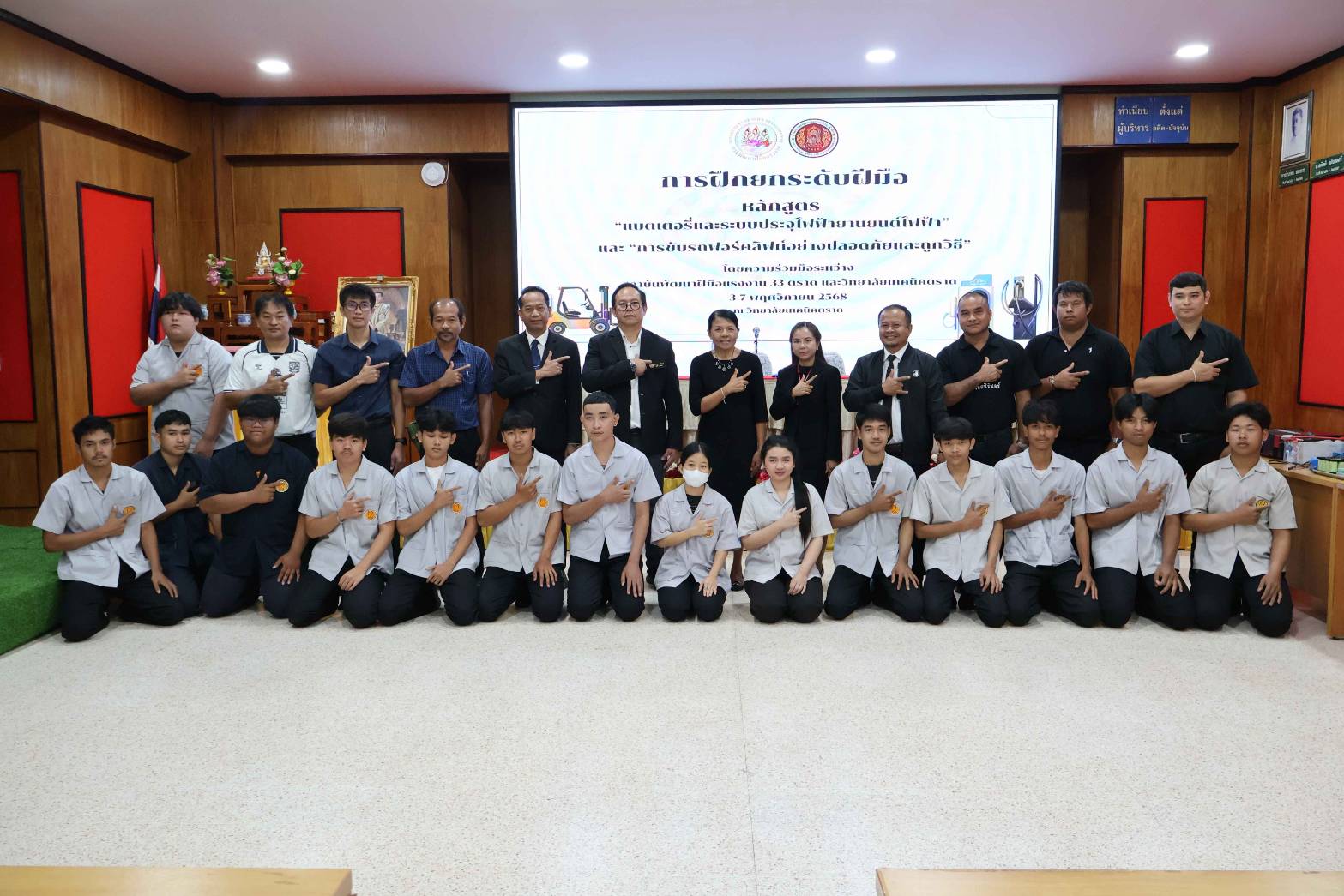 วันอังคารที่ 4 พฤศจิกายน 2568 เวลา 08.30 น. วิทยาลัยเทคนิคตราด ร่วมกับ สถาบันพัฒนาฝีมือแรงงาน 33 ตราด จัดโครงการอบรมหลักสูตรแบตเตอรี่และระบบประจุไฟฟ้ายานยนต์ และการขับรถฟอร์คลิฟท์อย่างปลอดภัยและถูกวิธี ระหว่างวันที่ 3 - 7 พฤศจิกายน 2568 ณ วิทยาลัยเทคนิคตราด เขต 2 โดยได้รับเกียรติจากนางสาวลักขณา รุ่งเรือง ผู้อำนวยการสถาบันพัฒนาฝีมือแรงงาน 33 ตราด เป็นประธานในพิธีเปิด และนายจิรพงค์ ร่มเงิน ผู้อำนวยการวิทยาลัยเทคนิคตราด กล่าวรายงานวัตถุประสงค์ของโครงการ ซึ่งมีวิทยากรผู้ทรงวุฒิ มาให้ความรู้ทั้งภาคทฤษฎีและภาคปฏิบัติให้กับนักศึกษาสาขาเทคนิคยานยนต์ไฟฟ้า และสาขาวิชาโลจิสติกส์และซัพพลายเชน เพื่อให้นักศึกษามีความรู้ความเข้าใจที่ถูกต้องและมีทักษะเชิงปฏิบัติในการบำรุงรักษา ตรวจสอบ และซ่อมแซมระบบได้อย่างปลอดภัย และมีประสิทธิภาพสูงสุด เพื่อรองรับการขยายตัวของตลาดอุตสาหกรรมในประเทศไทย โดยมีคณะผู้บริหาร ครู เข้าร่วมพิธีเปิดในครั้งนี้ ณ ห้องประชุมชั้น 2 อาคารวิทยบริการ วิทยาลัยเทคนิคตราด เขต 2