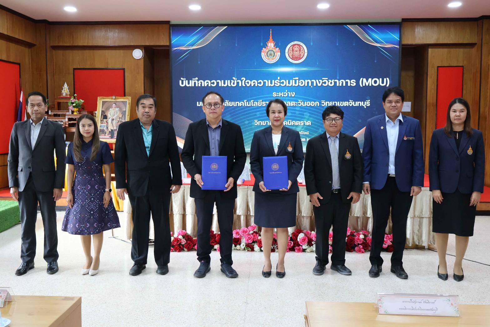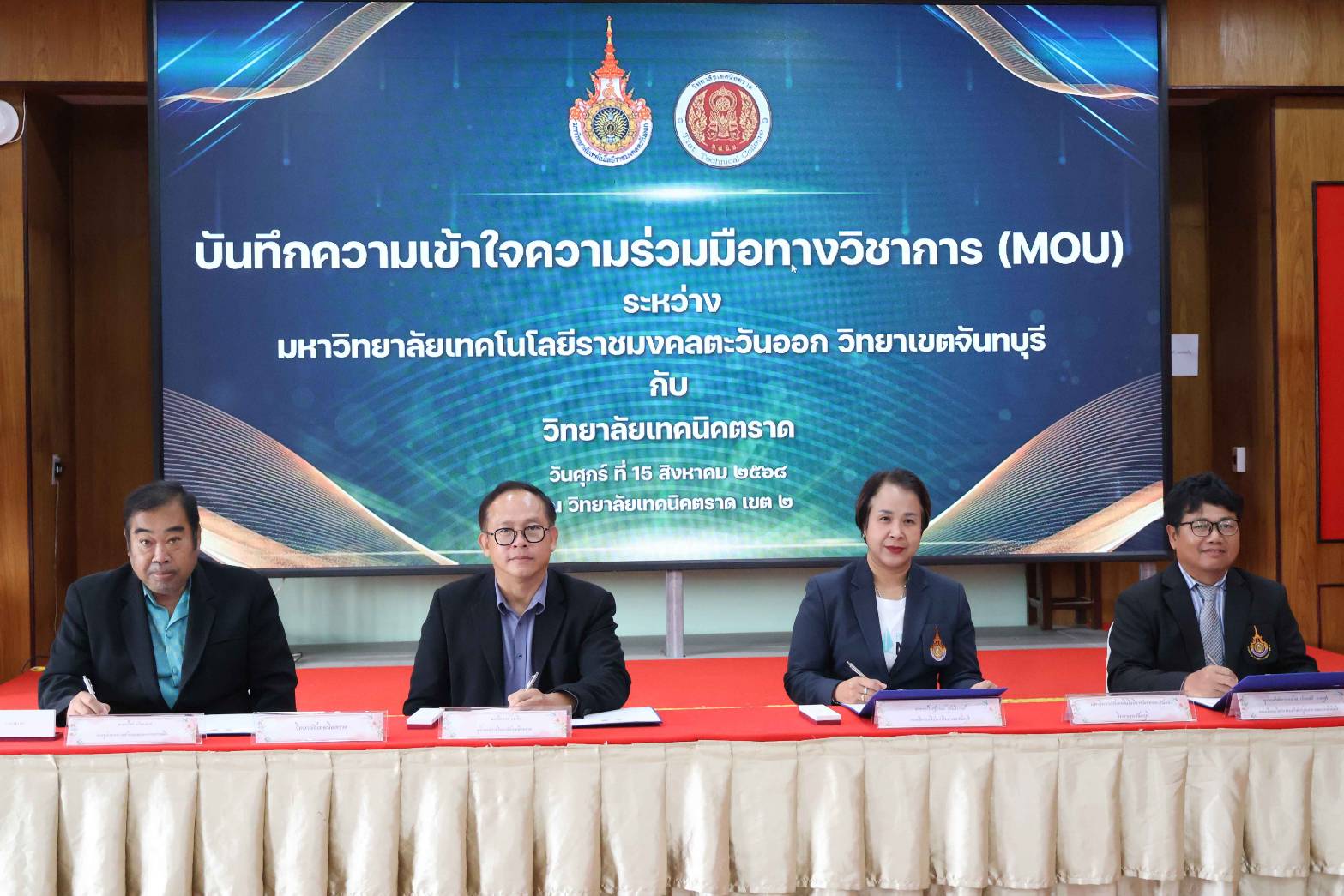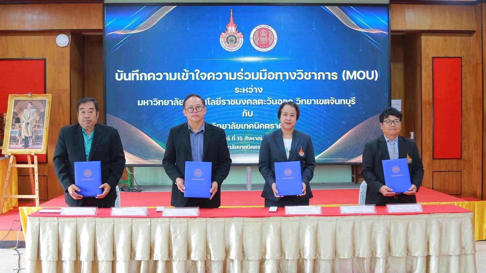 วันศุกร์ที่ 15 สิงหาคม 2568 เวลา 14.30 น. วิทยาลัยเทคนิคตราด ลงนามบันทึกความเข้าใจความร่วมมือทางวิชาการ (MOU) กับ มหาวิทยาลัยเทคโนโลยีราชมงคลตะวันออก วิทยาเขตจันทบุรี เพื่อร่วมมือกันดำเนินการจัดการศึกษา วิจัย ส่งเสริมและสนับสนุนการศึกษาต่อ การใช้ทรัพยากรร่วมกัน กิจกรรมพัฒนานักศึกษาระหว่างสถาบัน และร่วมมือในกิจกรรมต่างๆ โดยมีนายจิรพงค์ ร่มเงิน ผู้อำนวยการวิทยาลัยเทคนิคตราด พร้อมด้วยนายปรีชา ปานกลาง รองผู้อำนวยการฝ่ายแผนงานและความร่วมมือ และอาจารย์วีณัฐกานต์ รัตนธีรวงศ์ รองอธิการบดีประจำวิทยาเขตจันทบุรี ผู้ช่วยศาสตราจารย์ ดร.ประหยัด กองสุข คณบดีคณะวิศวกรรมศาสตร์บูรณาการและเทคโนโลยี ลงนามบันทึกความเข้าใจความร่วมมือทางวิชาการ (MOU) โดยมีนายยงยุทธ พนัสนอก รองผู้อำนวยการฝ่ายบริหารทรัพยากร นางสาวลัลน์ลลิต ปรีชาจารย์ รองผู้อำนวยการฝ่ายวิชาการ และผู้ช่วยศาสตราจารย์ ดร.เทอมศักดิ์ ปุระมงคล คณบดีคณะเทคโนโลยีอุตสาหกรรมการเกษตร ผู้ช่วยศาสตราจารย์กาญจนา ผลาผล คณบดีคณะเทคโนโลยีสังคม คณะครู ร่วมเป็นสักขีพยานในการลงนามบันทึกความเข้าใจความร่วมมือทางวิชาการ ในครั้งนี้ ณ ห้องประชุมชั้น 2 อาคารวิทยบริการ วิทยาลัยเทคนิคตราด เขต 2