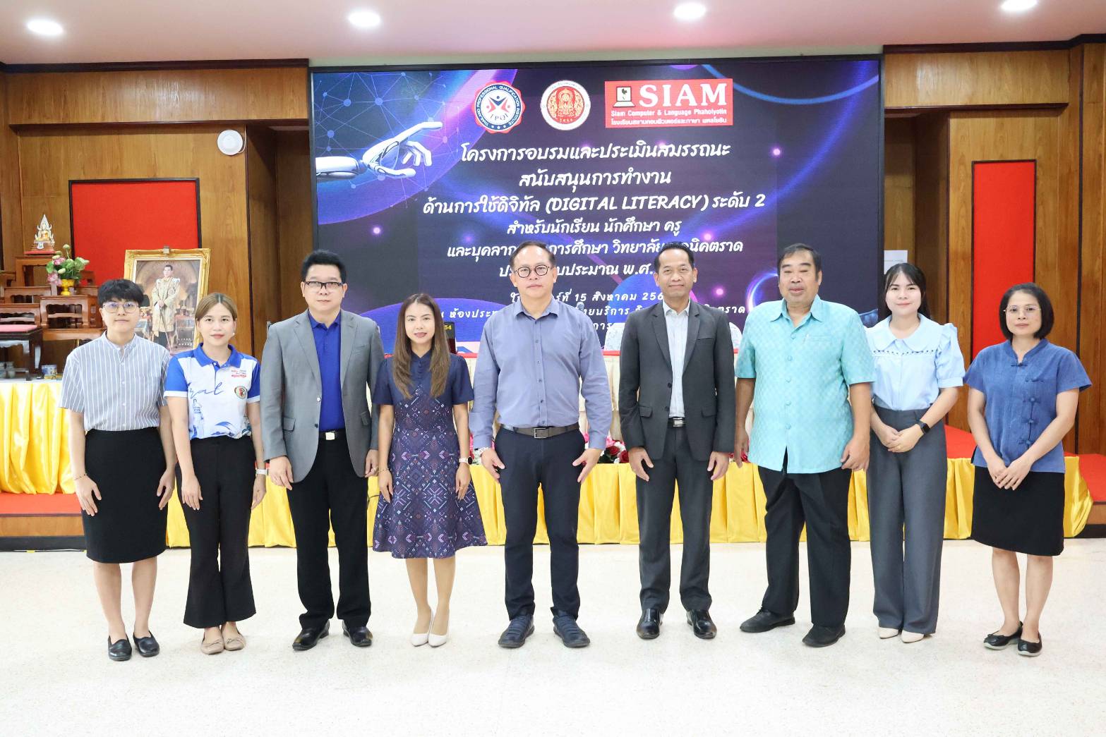 วันศุกร์ที่ 15 สิงหาคม 2568 เวลา 09.00 น. วิทยาลัยเทคนิคตราด ร่วมกับ โรงเรียนสยามคอมพิวเตอร์และภาษา จัดโครงการอบรมและประเมินสมรรถนะสนับสนุนการทำงานด้านการใช้ดิจิทัล (Digital Literacy) ระดับ 2 ให้กับนักเรียน นักศึกษา โดยได้รับเกียรติจากนายจิรพงค์ ร่มเงิน ผู้อำนวยการวิทยาลัยเทคนิคตราด ได้กล่าวต้อนรับคณะทีมงานจากโรงเรียนสยามคอมพิวเตอร์และภาษา ในฐานะองค์การรับรองสมรรถนะสนับสนุนการทำงานด้านการใช้ดิจิทัล (Digital Literacy) สถาบันคุณวุฒิวิชาชีพ (องค์การมหาชน) ซึ่งโครงการดังกล่าว เป็นการจัดอบรมและประเมินสมรรถนะสนับสนุนการทำงานด้านการใช้ดิจิทัล ให้กับนักเรียน นักศึกษา เพื่อเตรียมความพร้อมก่อนการประเมินฯ โดยผู้ผ่านการประเมินจะได้รับใบประกาศผล สำหรับใช้ในการศึกษาต่อในระดับปริญญาตรี และการสมัครเข้าทำงานในหน่วยงานราชการ หรือหน่วยงานเอกชนต่อไป โดยมีคณะผู้บริหาร ครู ร่วมให้การต้อนรับ ณ ห้องประชุมชั้น 2 อาคารวิทยบริการ วิทยาลัยเทคนิคตราด เขต 2
