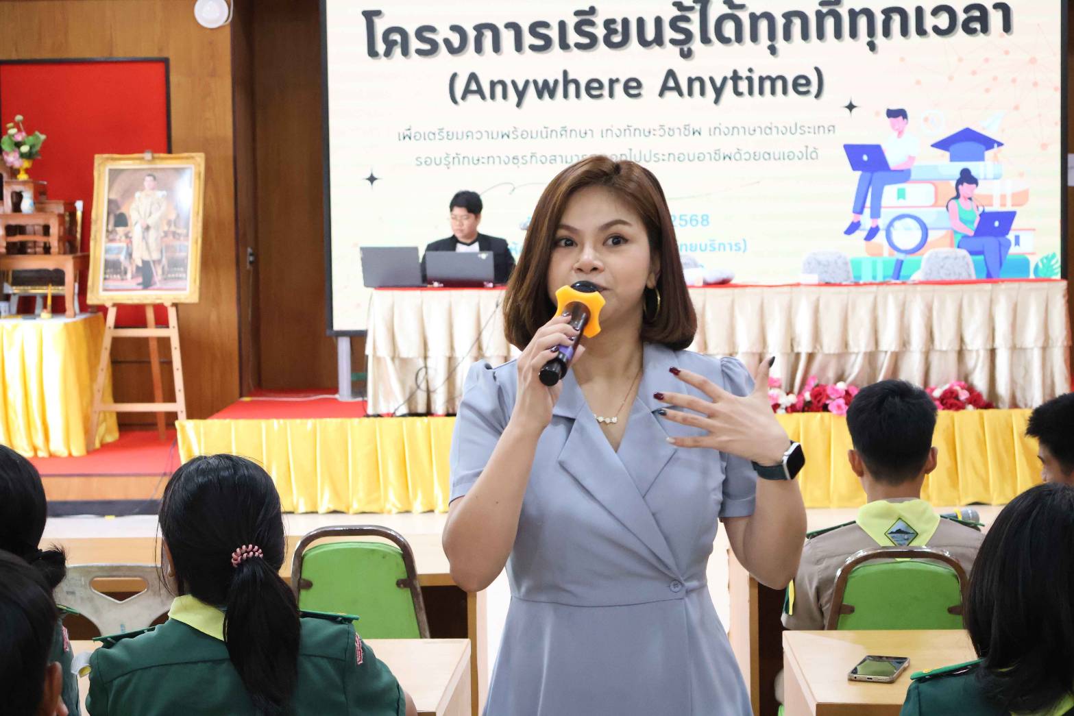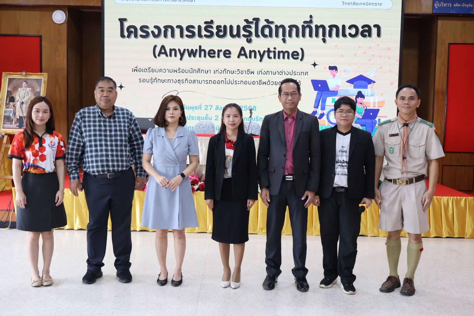วันพุธที่ 27 สิงหาคม 2568 วิทยาลัยเทคนิคตราด โดยงานสื่อการเรียนการสอน จัดโครงการเรียนรู้ได้ทุกที่ ทุกเวลา (Anywhere Anytime) เพื่อเตรียมความพร้อมนักศึกษาเก่งทักษะวิชาชีพ เก่งภาษาต่างประเทศ รอบรู้ทักษะทางธุรกิจ สามารถออกไปประกอบอาชีพด้วยตนเองได้ ให้กับนักเรียน นักศึกษา โดยได้รับเกียรติจากนางสาวลัลน์ลลิต ปรีชาจารย์ รองผู้อำนวยการฝ่ายวิชาการ เป็นประธานในพิธีเปิดโครงการ และมีวิทยากรจากวิทยาลัยเทคนิคจันทบุรี นางสาวปุณจรีย์ เจริญสุข มาให้ความรู้กับนักเรียน นักศึกษา ในเรื่อง Communication at Work และ Business World เพื่อให้ผู้เรียนมีความสามารถสื่อสารได้ และสามารถประกอบอาชีพอิสระของตนเองได้ มีความรอบรู้ในเชิงธุรกิจการตลาด โดยเฉพาะอย่างยิ่งธุรกิจและการตลาดในยุคดิจิทัล โดยมีคณะผู้บริหาร คณะครู ร่วมในพิธีเปิด ณ ห้องประชุมชั้น 2 อาคารวิทยบริการ วิทยาลัยเทคนิคตราด เขต 2
