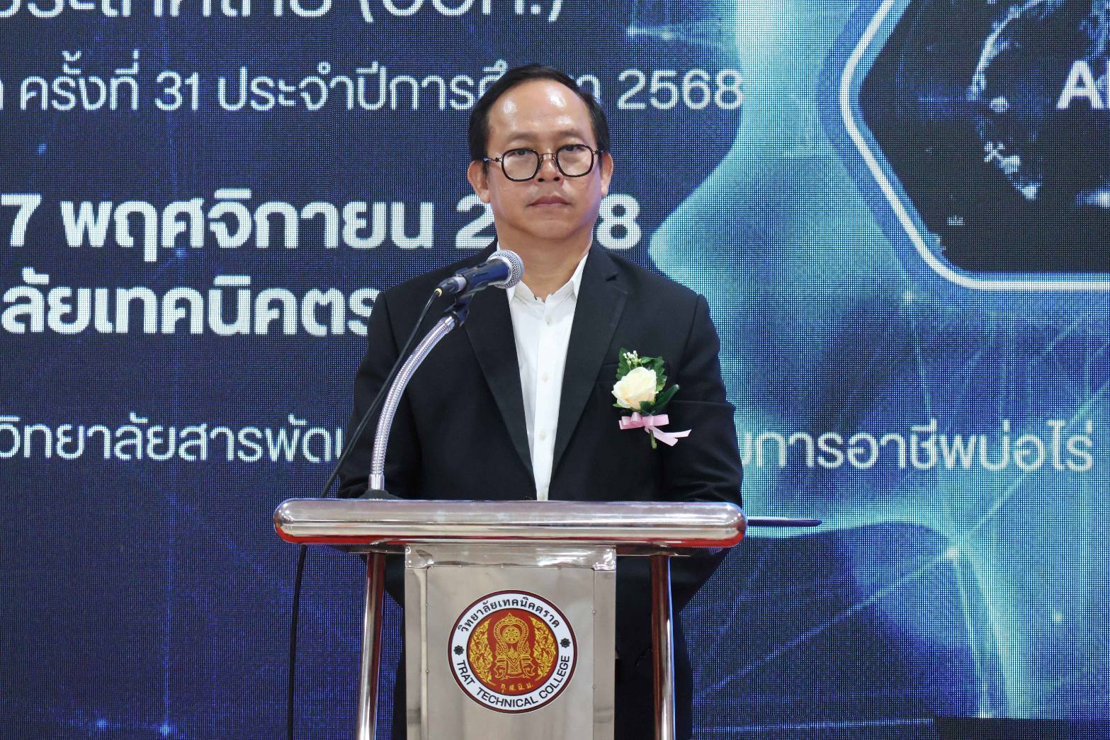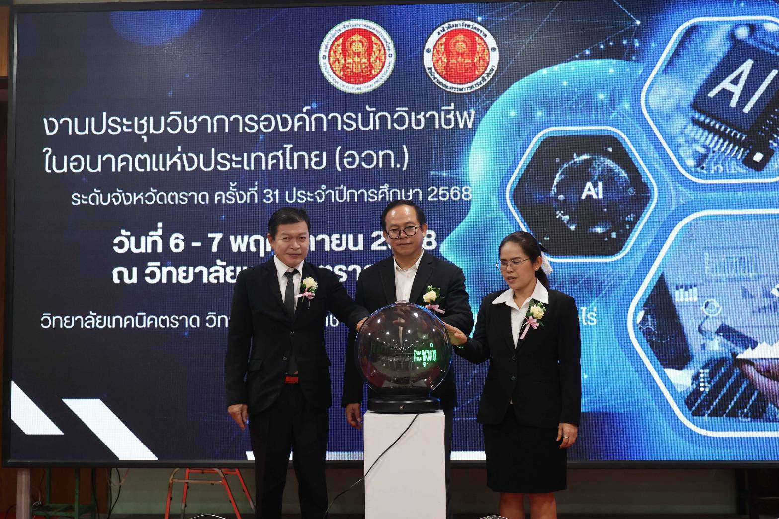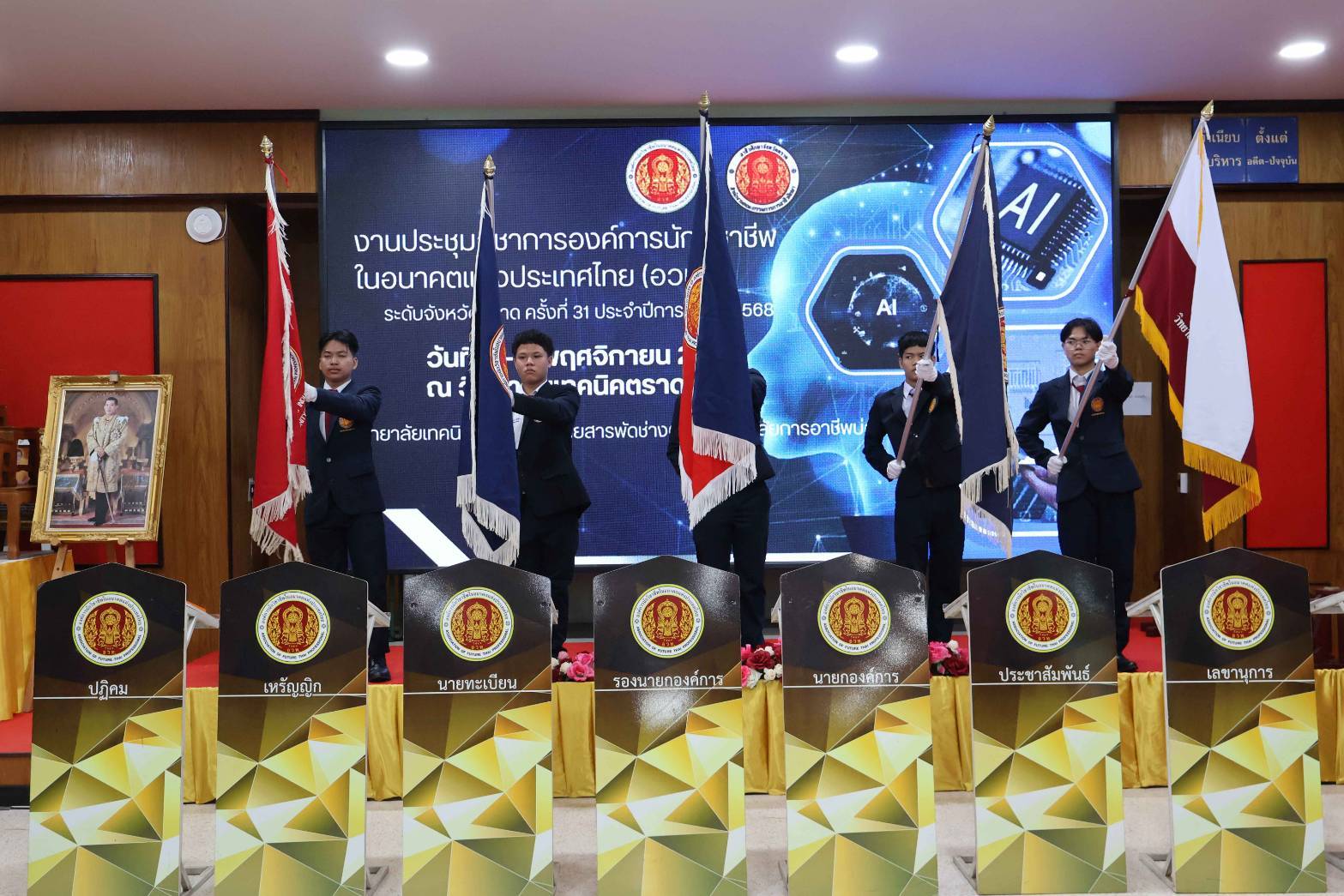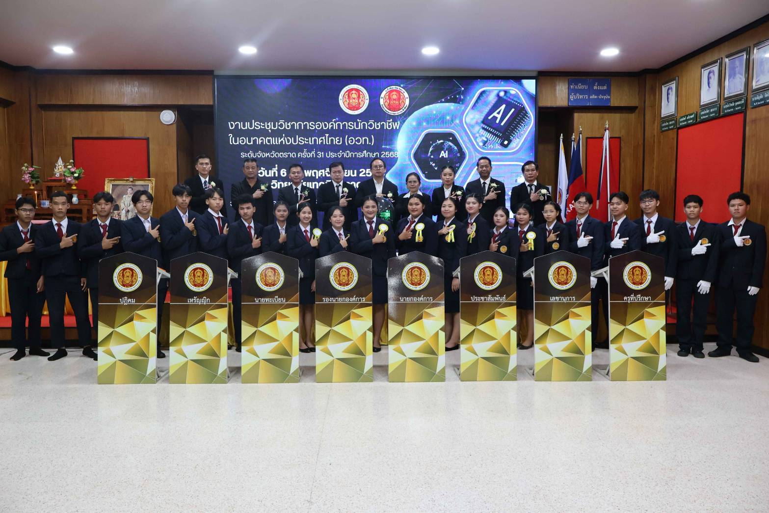 วันศุกร์ที่ 7 พฤศจิกายน 2568 เวลา 09.30 น. สำนักงานอาชีวศึกษาจังหวัดตราด จัดพิธีเปิดงานประชุมวิชาการองค์การนักวิชาชีพในอนาคตแห่งประเทศไทย (อวท.) การแข่งขันทักษะวิชาชีพ และทักษะพื้นฐาน ระดับจังหวัดตราด ครั้งที่ 31 ประจำปีการศึกษา 2568 โดยได้รับเกียรติจากนายจิรพงค์ ร่มเงิน ผู้อำนวยการวิทยาลัยเทคนิคตราด ปฏิบัติหน้าที่ผู้อำนวยการสำนักงานอาชีวศึกษาจังหวัดตราด เป็นประธานในพิธีเปิดฯ ซึ่งก่อนพิธีเปิดได้นำคณะผู้บริหาร คณะครู บุคลากรทางการศึกษา และนักเรียน นักศึกษา ยืนสงบนิ่งถวายความอาลัย แด่สมเด็จพระนางเจ้าสิริกิติ์ พระบรมราชินีนาถ พระบรมราชชนนีพันปีหลวง การจัดงานในครั้งนี้ มีวัตถุประสงค์เพื่อให้นักเรียน นักศึกษา นำความรู้ประสบการณ์ที่ได้รับในการเรียนการสอน มาประยุกต์ใช้จริง และเพื่อคัดเลือกตัวแทนนักเรียน นักศึกษา แต่ละทักษะวิชาชีพ และทักษะพื้นฐาน เข้าร่วมการแข่งขันระดับอาชีวศึกษาภาค ภาคตะวันออกและกรุงเทพมหานคร โดยมีคณะผู้บริหาร ครู บุคลากรทางการศึกษา และนักเรียน นักศึกษา ในสังกัดสำนักงานอาชีวศึกษาจังหวัดตราด ร่วมในพิธีเปิดอย่างพร้อมเพรียงกัน ณ ห้องประชุมชั้น 2 อาคารวิทยบริการ วิทยาลัยเทคนิคตราด เขต 2