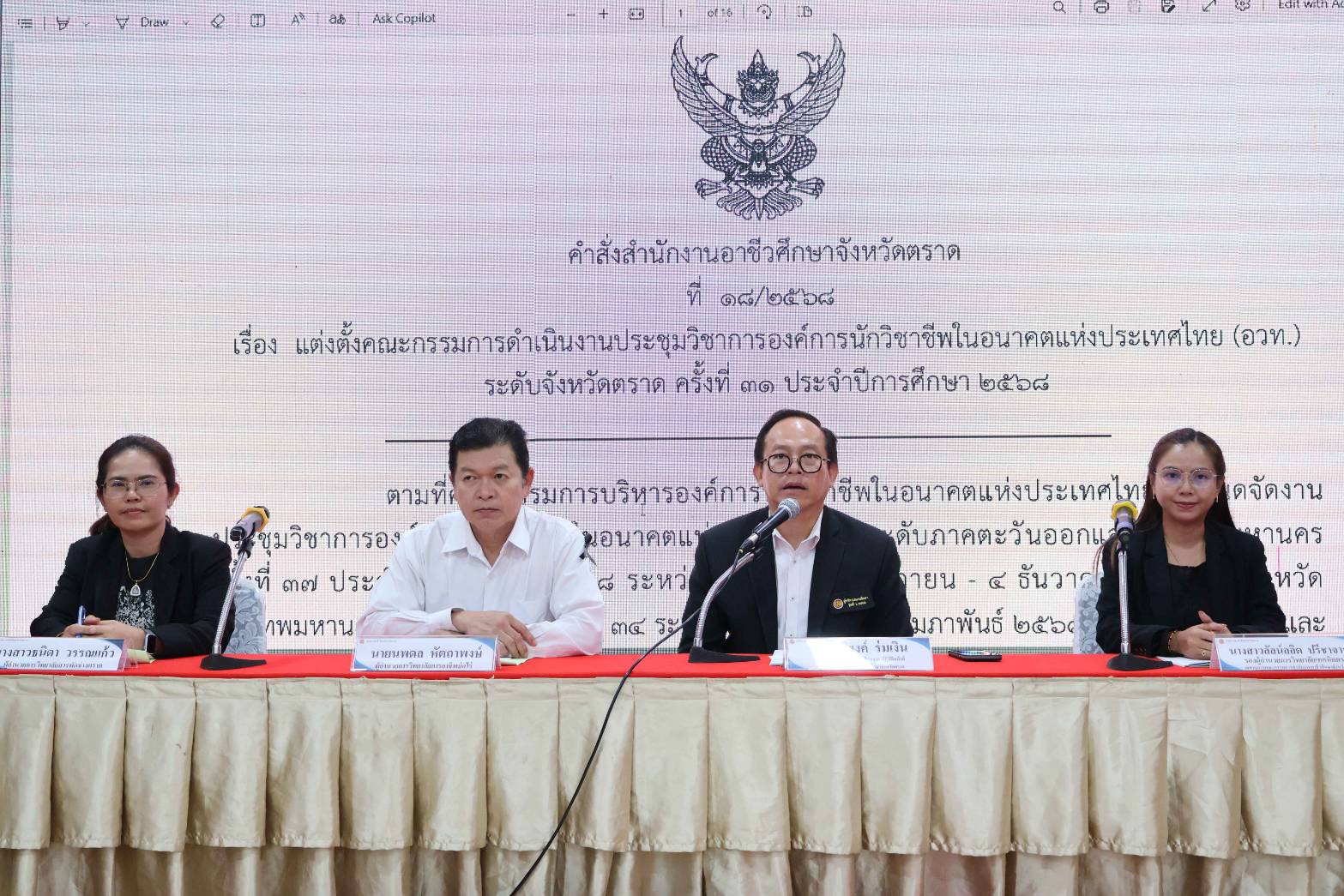 วันพุธที่ 5 พฤศจิกายน 2568 เวลา 13.30 น. สำนักงานอาชีวศึกษาจังหวัดตราด ประชุมเตรียมความพร้อมการจัดงานประชุมวิชาการองค์การนักวิชาชีพในอนาคตแห่งประเทศไทย (อวท.) ระดับจังหวัดตราด ครั้งที่ 31 ประจำปีการศึกษา 2568 ระหว่างวันที่ 6 - 7 พฤศจิกายน 2568 ณ วิทยาลัยเทคนิคตราด เขต 2 โดยนายจิรพงค์ ร่มเงิน ผู้อำนวยการวิทยาลัยเทคนิคตราด ปฏิบัติหน้าที่ผู้อำนวยการสำนักงานอาชีวศึกษาจังหวัดตราด เป็นประธานในการประชุมฯ พร้อมด้วยนายนพดล หัตถาพงษ์ ผู้อำนวยการวิทยาลัยการอาชีพบ่อไร่ นางสาวธนิดา วรรณแก้ว ผู้อำนวยการวิทยาลัยสารพัดช่างตราด และนางสาวลัลน์ลลิต ปรีชาจารย์ รองผู้อำนวยการวิทยาลัยเทคนิคตราดในฐานะเลขานุการคณะกรรมการสำนักงานอาชีวศึกษาจังหวัดตราด ประชุมเตรียมความพร้อมการจัดงานประชุมวิชาการองค์การนักวิชาชีพในอนาคตแห่งประเทศไทย (อวท.) ระดับจังหวัดตราด ซึ่งวิทยาลัยเทคนิคตราด เป็นเจ้าภาพจัดการแข่งขันทักษะวิชาชีพ และวิทยาลัยการอาชีพบ่อไร่ เป็นเจ้าภาพจัดการแข่งขันทักษะพื้นฐาน พร้อมทั้งพิจารณาตารางกำหนดการแข่งขันฯ สถานที่ รูปแบบการจัดงาน จุดรับลงทะเบียน - ส่งเอกสารการแข่งขันฯ รวมถึงการแต่งกายในงานประชุมวิชาการฯ โดยมีคณะผู้บริหาร คณะครู บุคลากรทางการ ศึกษา ในสังกัดสำนักงานอาชีวศึกษาจังหวัดตราด เข้าร่วมประชุมอย่างพร้อมเพรียงกัน ณ ห้องประชุมชั้น 2 อาคารวิทยบริการ วิทยาลัยเทคนิคตราด เขต 2