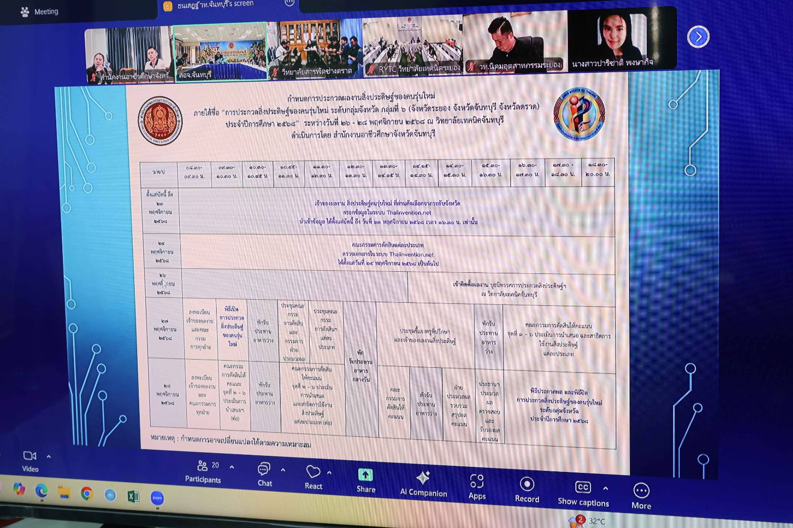 วันศุกร์ที่ 14 พฤศจิกายน 2568 เวลา 13.30 น. นายจิรพงค์ ร่มเงิน ผู้อำนวยการวิทยาลัยเทคนิคตราด ปฏิบัติหน้าที่ผู้อำนวยการสำนักงานอาชีวศึกษาจังหวัดตราด พร้อมด้วยนางสาวลัลน์ลลิต ปรีชาจารย์ รองผู้อำนวยการวิทยาลัยเทคนิคตราดในฐานะเลขานุการคณะกรรมการสำนักงานอาชีวศึกษาจังหวัดตราด นายโสณะ บำเหน็จ หัวหน้างานวิจัยนวัตกรรมและสิ่งประดิษฐ์ และผู้ที่เกี่ยวข้อง ประชุมเตรียมความพร้อมการประกวดสิ่งประดิษฐ์ของคนรุ่นใหม่ ระดับกลุ่มจังหวัด กลุ่มที่ 6 (จังหวัดระยอง จังหวัดจันทบุรี จังหวัดตราด) ประจำปีการศึกษา 2568 ระหว่างวันที่ 26 - 28 พฤศจิกายน 2568 ณ วิทยาลัยเทคนิคจันทบุรี ผ่านระบบ Zoom Meeting เพื่อพิจารณาร่างคำสั่งแต่งตั้งคณะกรรมการดำเนินงาน/ คณะกรรมการตัดสิน/ กำหนดการ/ พิธีเปิด/ สถานที่ การประกวดสิ่งประดิษฐ์ของคนรุ่นใหม่ ระดับกลุ่มจังหวัด ภาคตะวันออกและกรุงเทพมหานคร ประจำปีการศึกษา 2568 กลุ่มที่ 6 (จังหวัดระยอง จังหวัดจันทบุรี จังหวัดตราด) ณ ห้องปฏิบัติราชการผู้อำนวยการวิทยาลัยเทคนิคตราด อาคารวิทยบริการ วิทยาลัยเทคนิคตราด เขต 2