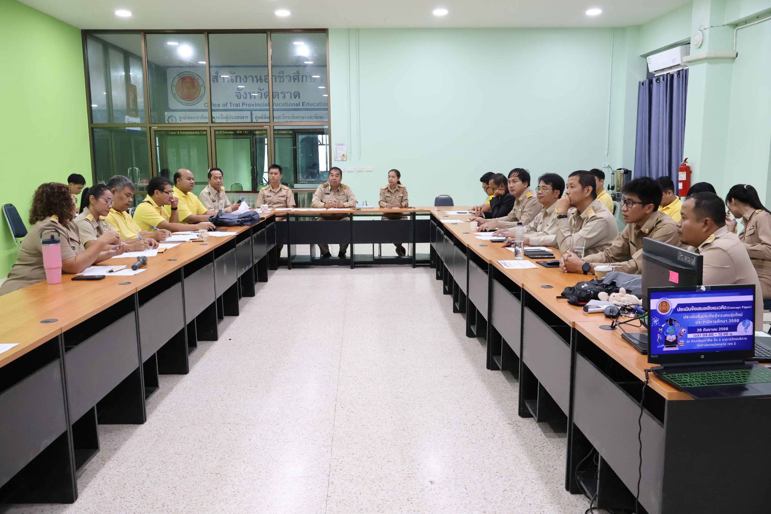 วันจันทร์ที่ 29 กันยายน 2568 เวลา 09.00 น. นายปรีชา ปานกลาง รองผู้อำนวยการฝ่ายแผนงานและความร่วมมือ พร้อมด้วยนายยงยุทธ พนัสนอก รองผู้อำนวยการฝ่ายบริหารทรัพยากร และนางสาวลัลน์ลลิต ปรีชาจารย์ รองผู้อำนวยการฝ่ายวิชาการ ร่วมการประเมินข้อเสนอเชิงแนวคิด (Concept Paper) / ประเมินสิ่งประดิษฐ์ของคนรุ่นใหม่ ประจำปีการศึกษา 2568 (ระดับสถานศึกษา) โดยมีวัตถุประสงค์เพื่อส่งเสริมสนับสนุนการวิจัยและพัฒนานวัตกรรมและเทคโนโลยีสิ่งประดิษฐ์อาชีวศึกษาทุกระดับชั้นของสถานศึกษาในสังกัด ซึ่งมีผลงานที่เข้าร่วมการประเมินฯในครั้งนี้ จำนวน 8 ผลงาน สำหรับผลงานที่ได้รับการคัดเลือกจะได้เข้าร่วมการประเมิน(Concept Paper) ระดับอาชีวศึกษาจังหวัดตราด ต่อไป ณ ห้องเรียนอาชีพชั้น 2 อาคารวิทยบริการ วิทยาลัยเทคนิคตราด เขต 2